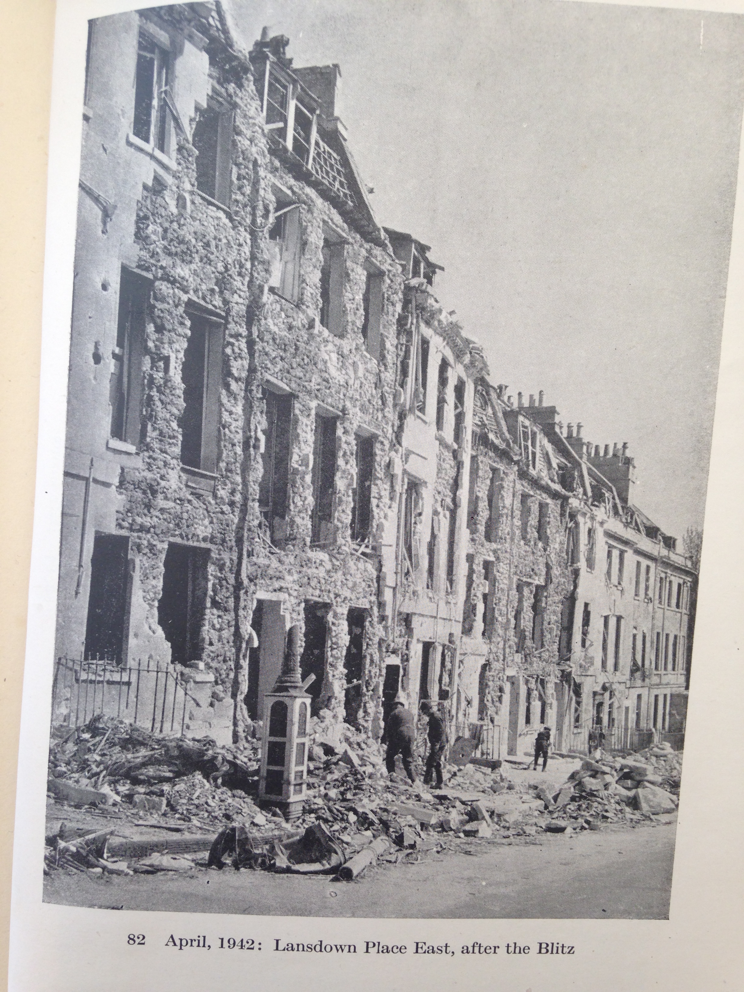 I was looking at an old Batsford book about Bath and found this photo of Lansdown Place East after a bombing raid during the Blitz. There are still visible craters in the grass in front of Lansdown Crescent, now grazed peacefully by sheep.